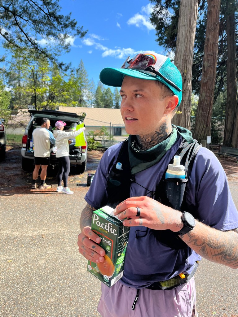 The weather remained unpredictable. As I focused on reaching the mile 24 about aid station, where I would see my crew for the first time, the sun came out in full force. It created a hot, humid environment as I descended into the canyons and then climbed back out toward Michigan Bluff. But just as I reached the top, the weather shifted again—overcast skies gave way to torrential rain, seemingly timed perfectly with my arrival at the aid station. I made a quick stop, grabbing the baggie of supplies I had prepared beforehand and swapping my soaked lightweight jacket for a heavier-duty raincoat my crew had ready. It was clear that I’d need it for whatever was coming next.