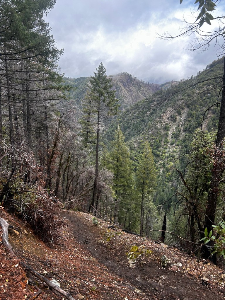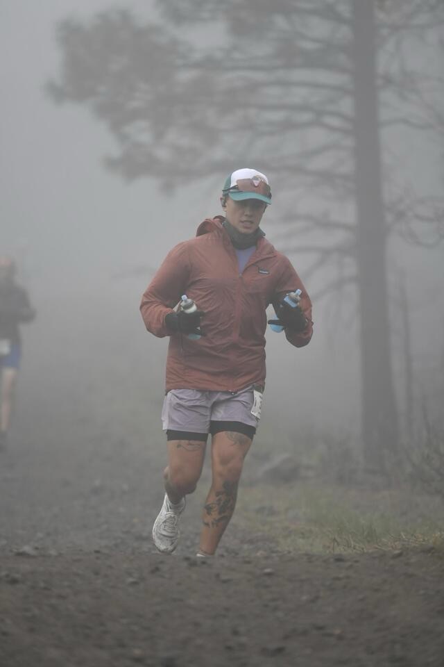 I left the aid station feeling strong and confident, pushing the pace. I quickly found myself alone, having lost the group of runners I had been with earlier, but I didn’t mind. The first 16 miles of this stretch flew by. The conditions were stable, the environment felt welcoming, and I was taking in calories with ease. It was smooth sailing until I reached the bottom of a large canyon, right before the climb to Drivers Flat. That’s when the weather shifted once again—sudden downpours, thunder, and lightning. As someone who’s always had a fear of lightning, I tried to keep my head down and push through without thinking too much about it.